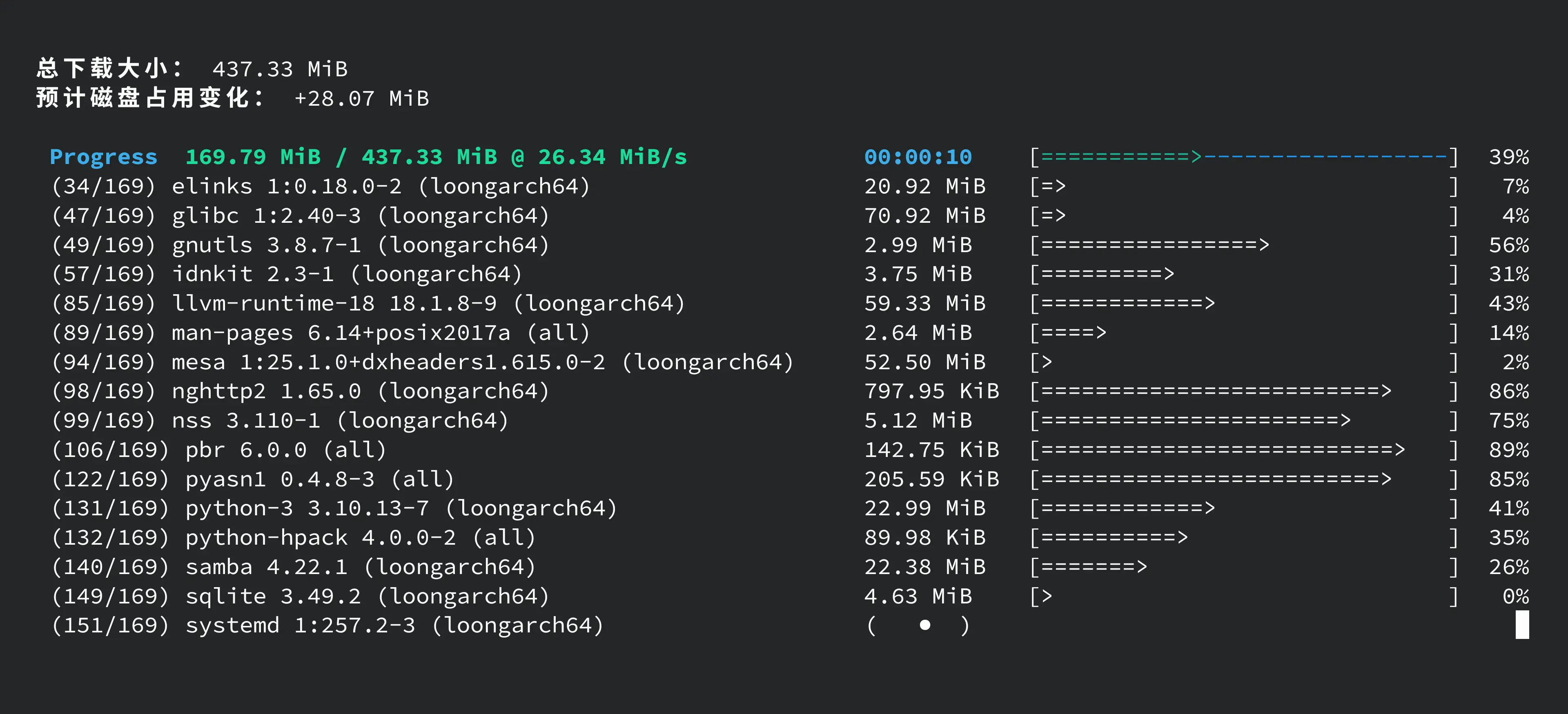 说来 oma 有个老毛病:在软件包或版本号名较长的时候,进度条可能无法正确对齐,这让强迫症患者们很是苦恼。oma 1.18 通过重构这一部分界面的绘制和布局计算逻辑,彻底修复了这一问题: