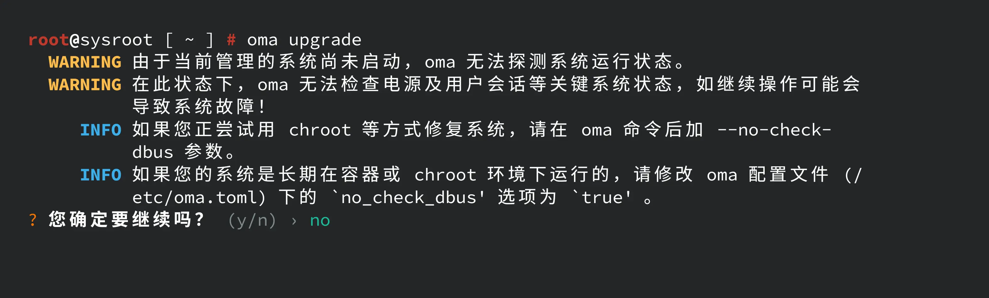 然而,一两次还好,(尤其是在 chroot 环境修复系统的时候)多了血压就高了对吧?这可不行。于是乎,oma 1.18 对这一警告进行了修改并引入了是/否询问: