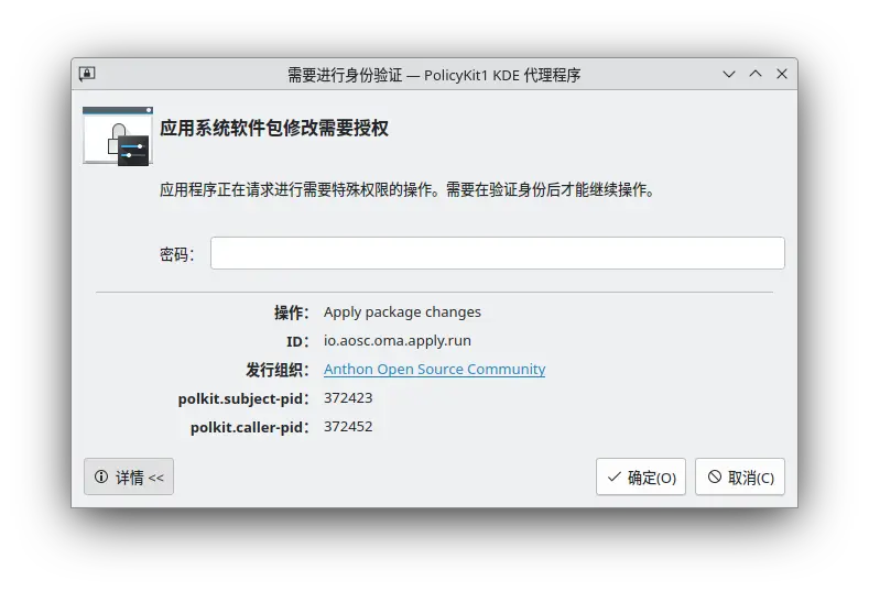 先前版本的 oma 未正确设置其可执行文件的路径,导致图形化提权无法正确显示提权原因。oma 1.18 已修正这一问题: