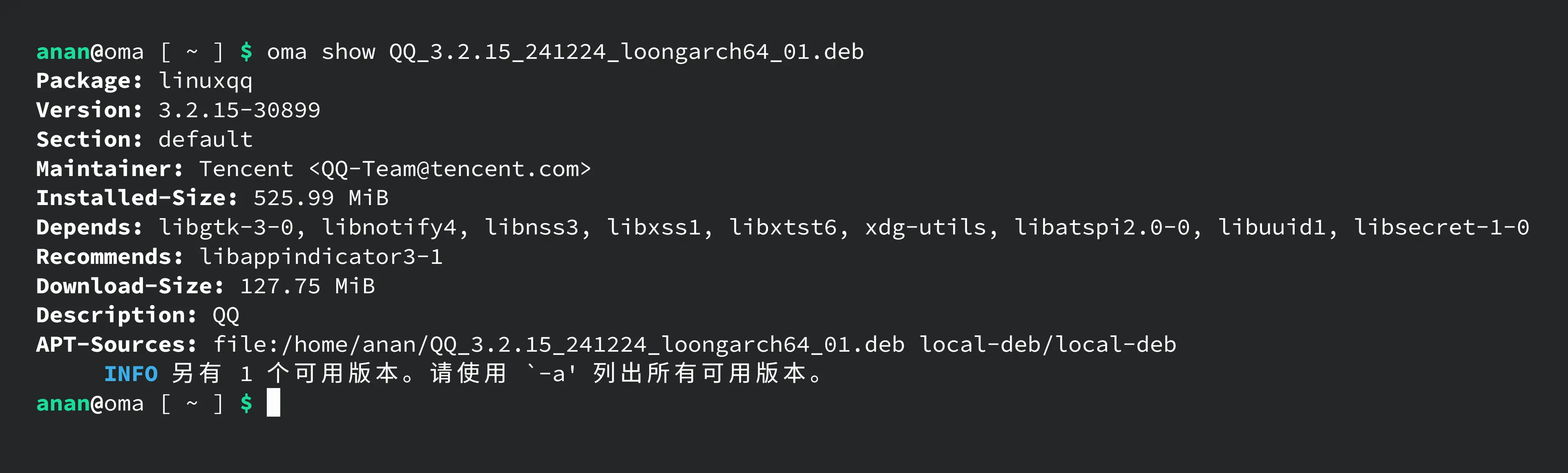 为方便用户朋友直接查看本地或第三方软件包的依赖等信息,oma 1.18 引入了本地软件包元信息读取支持。