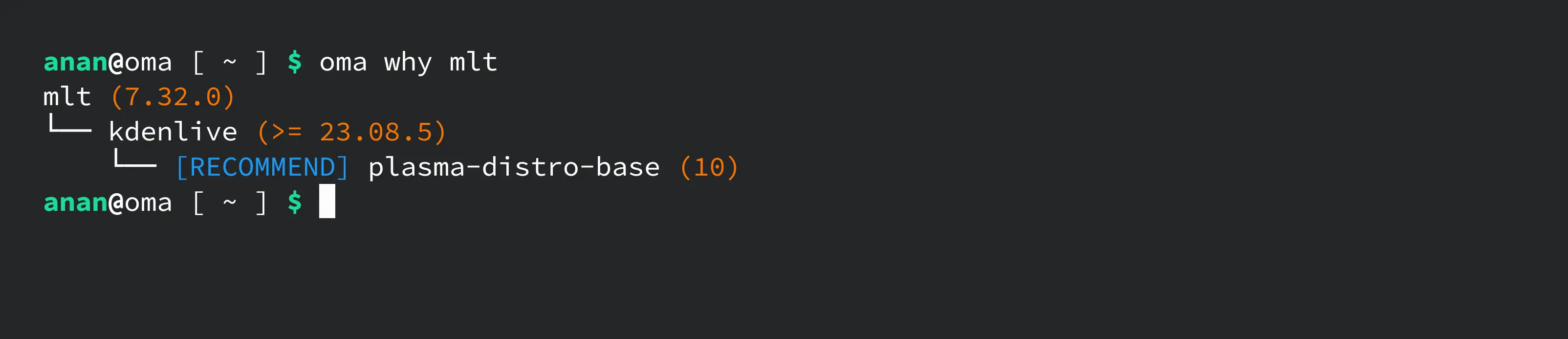 继 oma 1.17 引入软件包磁盘占用分析器后,oma 1.18 针对用户希望分析系统存储占用、查看软件包安装情况的需求,新增了依赖树分析器功能。依赖树分析器使用十分简单,输入如下命令: