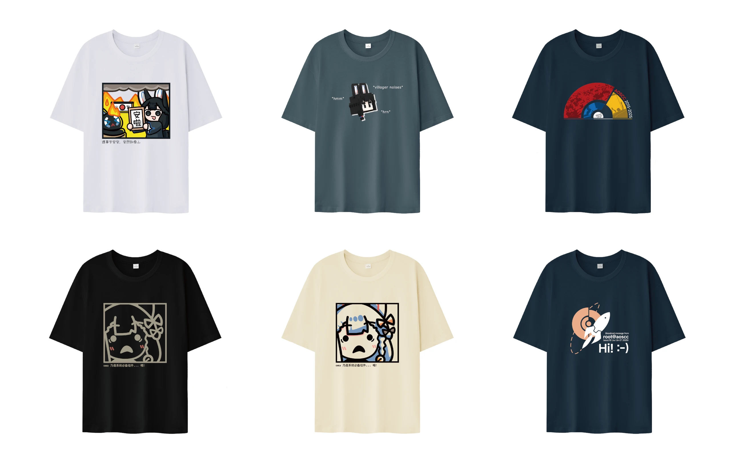 本周例会评审通过了 6 款(含一款为志愿者准备的)文化衫设计及一款双面帆布袋设计(供参会者使用),预览如下: